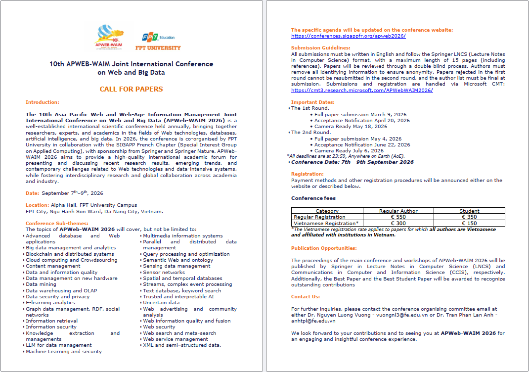 Hội nghị quốc tế APWEB-WAIM lần thứ 10 về Web và Big Data khu vực Châu Á Thái Bình Dương là một hội nghị khoa học quốc tế uy tín được tổ chức hàng năm, quy tụ các nhà nghiên cứu, chuyên gia và học giả trong các lĩnh vực công nghệ Web, cơ sở dữ liệu, trí tuệ nhân tạo (AI) và dữ liệu lớn (Big Data).