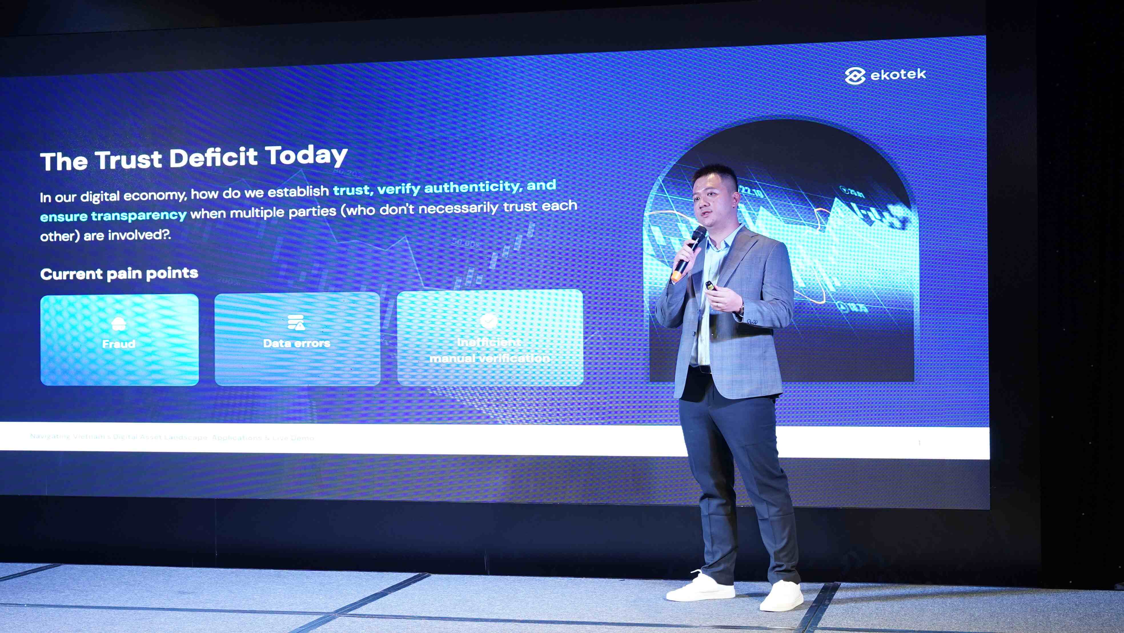 Phát biểu tại sự kiện, ông Đỗ Đình Đông – CEO Ekotek khẳng định Blockchain đang giữ vai trò hạ tầng cốt lõi giúp tăng cường tính minh bạch, tin cậy trong các hoạt động giao dịch và quản trị. Công nghệ chuỗi khối không chỉ giới hạn trong lĩnh vực tài chính, mà đã mở rộng sang logistics, thương mại điện tử, quản lý chuỗi cung ứng, và đặc biệt là các mô hình dữ liệu phân tán trong đô thị thông minh.