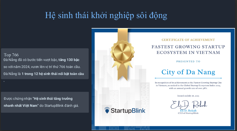 Với những kết quả đáng tự hào, năm 2025, Đà Nẵng tăng 130 bậc trong bảng xếp hạng toàn cầu, vươn lên vị trí thứ 766 trong top 1.000 thành phố tiêu biểu toàn cầu về hệ sinh thái khởi nghiệp, được StartupBlink chứng nhận là hệ sinh thái tăng trưởng nhanh nhất Việt Nam. Đây là thành quả của sự kết hợp chặt chẽ giữa chính sách hỗ trợ, nguồn nhân lực trẻ sáng tạo và mạng lưới hợp tác quốc tế ngày càng mở rộng.