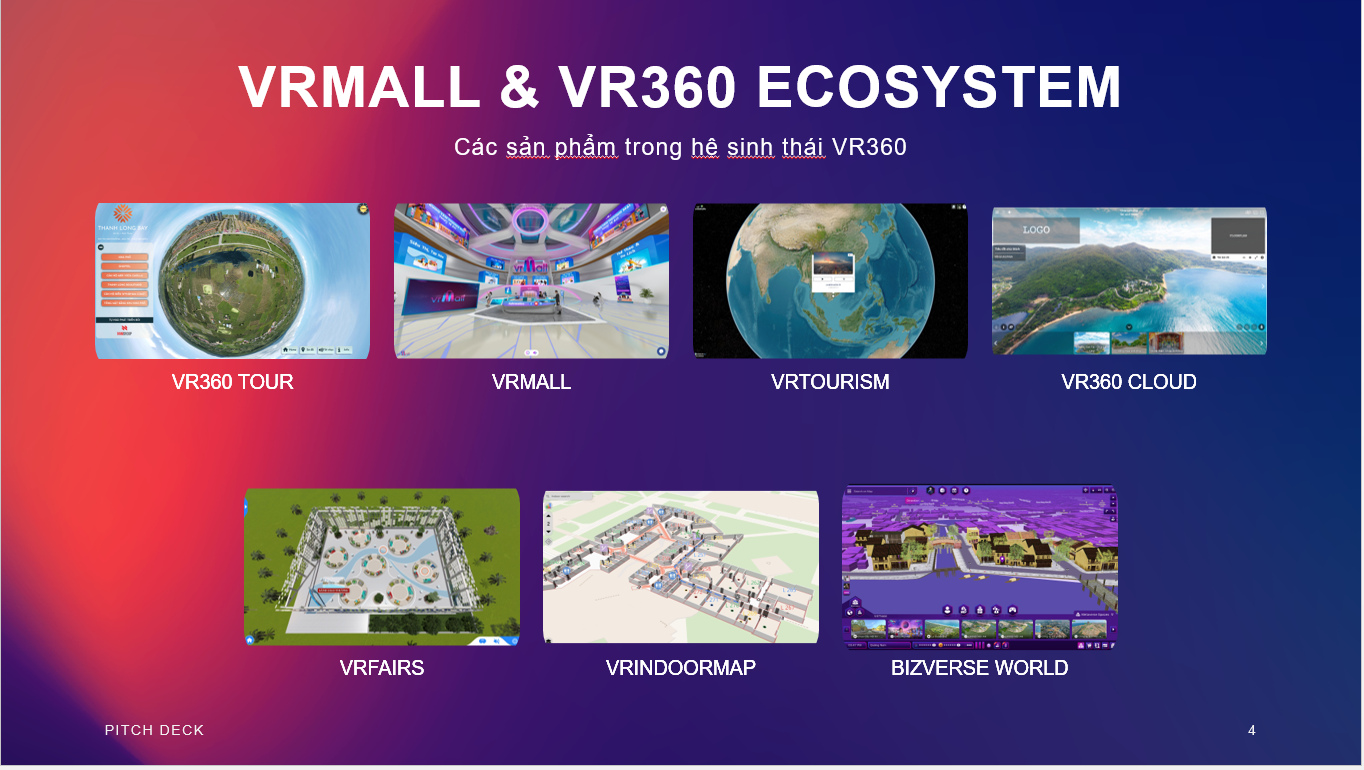 VRMall và hệ sinh thái VR360 bao gồm: VRMall, Virtual Tour, VRTourism, VR360 Cloud, VRFairs, VRIndoorMap, 3D/AR Model và Bizverse World. Dự án này được xây dựng và phát triển bởi Công ty Cổ phần Giải pháp Chuyển đổi Số. Dựa trên các công nghệ mới nhất về VR, AR, 3D, 360, Digital Twin, Metaverse…, hệ sinh thái giúp doanh nghiệp tạo ra lợi thế cạnh tranh so với đối thủ và rút ngắn khoảng cách giữa doanh nghiệp và khách hàng khi tạo ra những trải nghiệm mới, chân thực cho khách hàng.