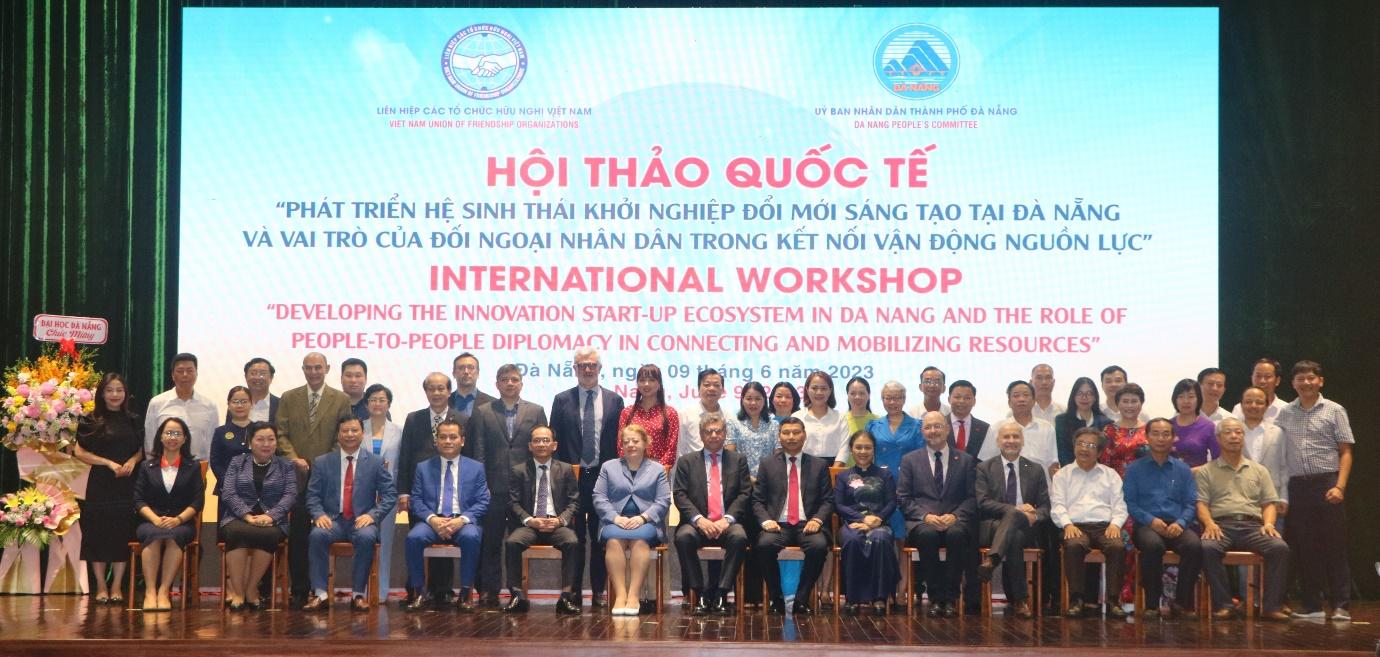 Delegates taking commemorative photos at the international seminar "Development of the Innovative Startup Ecosystem in Da Nang and the Role of People's Diplomacy in Mobilizing Resources. Photo: PV