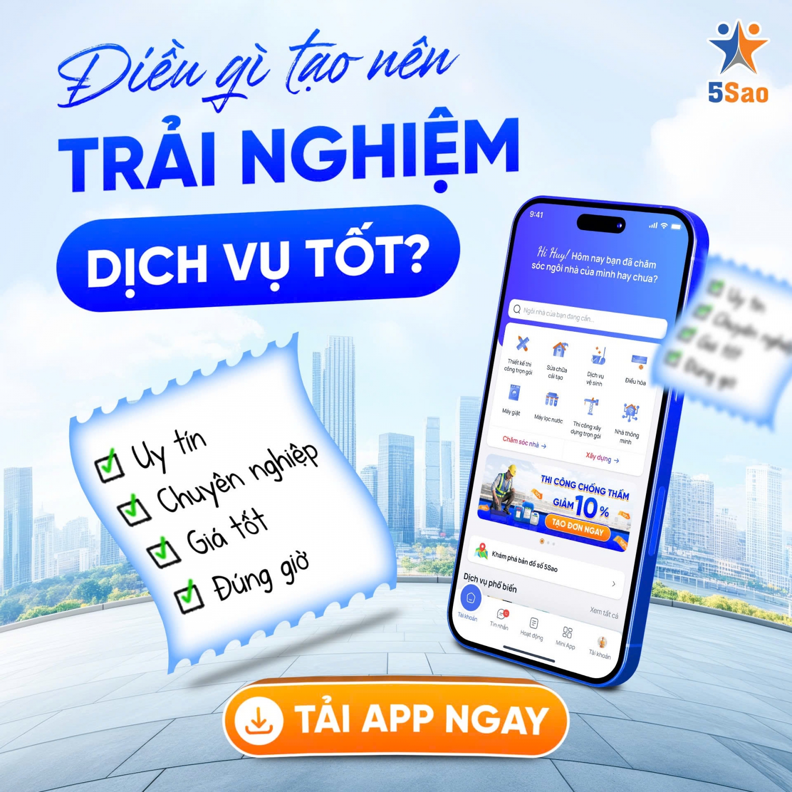 Bản chất của việc bảo trì nhà cửa không chỉ là sửa chữa một thiết bị hỏng, mà là mang lại sự thảnh thơi cho gia chủ. Với 5Sao, một dịch vụ tử tế bắt đầu từ việc thợ đến đúng giờ, tác phong gọn gàng, lễ phép và có ý thức giữ gìn không gian sống của khách hàng.