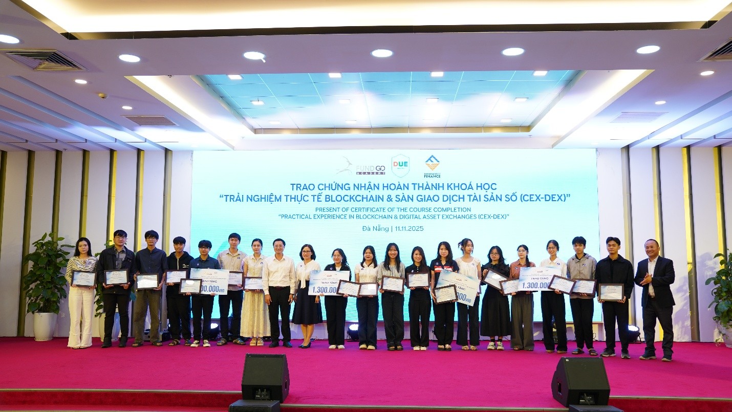 Sự kiện cũng vinh danh những sinh viên tham gia khóa học “Trải nghiệm thực tế Blockchain & Sàn giao dịch tài sản số” do FundGo Academy phối hợp cùng Trường Đại học Kinh tế – Đại học Đà Nẵng và Mạng lưới CLB Khởi nghiệp Hub Network tổ chức. Khóa học giúp các bạn sinh viên tiếp cận kiến thức về blockchain và tài sản số qua hình thức thực hành trực tiếp, rèn luyện kỹ năng phát triển DApp, triển khai smart contract và giao dịch tài sản số, qua đó góp phần xây dựng lực lượng nhân tài trẻ sẵn sàng cho kỷ nguyên kinh tế số.