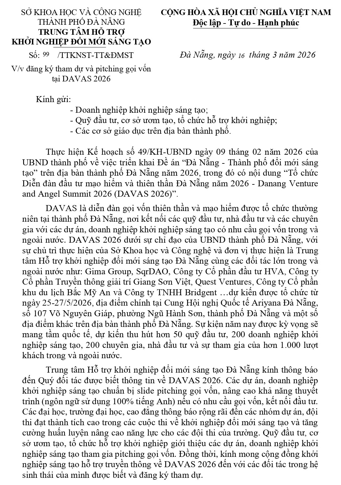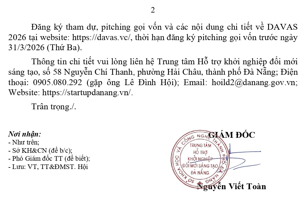 Thông báo về việc đăng ký tham dự và pitching gọi vốn tại DAVAS 2026