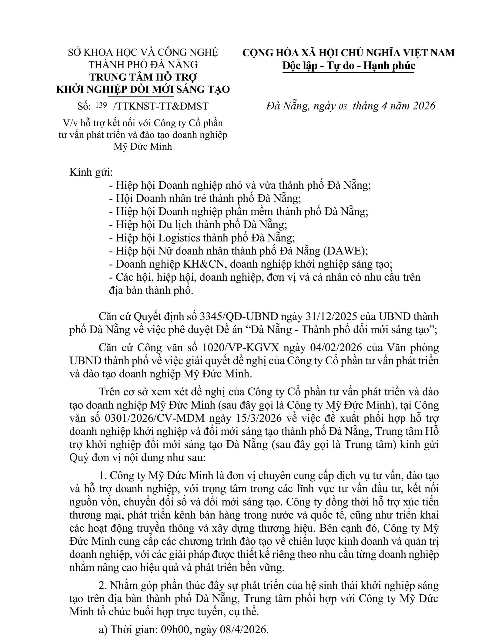 Thông báo về việc hỗ trợ kết nối với Công ty Cổ phần tư vấn phát triển và đào tạo doanh nghiệp Mỹ Đức Minh