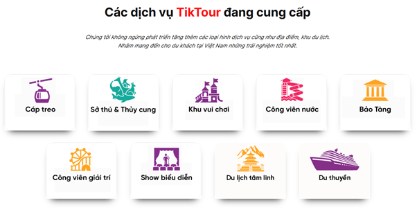 Hiện tại, TikTour đang mở rộng hợp tác với nhiều khu du lịch lớn tại TP.HCM và các tỉnh thành, đồng thời phát triển thêm các tiện ích như gợi ý lịch trình, tích điểm người dùng, mã giảm giá định kỳ... để tạo nên trải nghiệm trọn vẹn cho khách hàng.