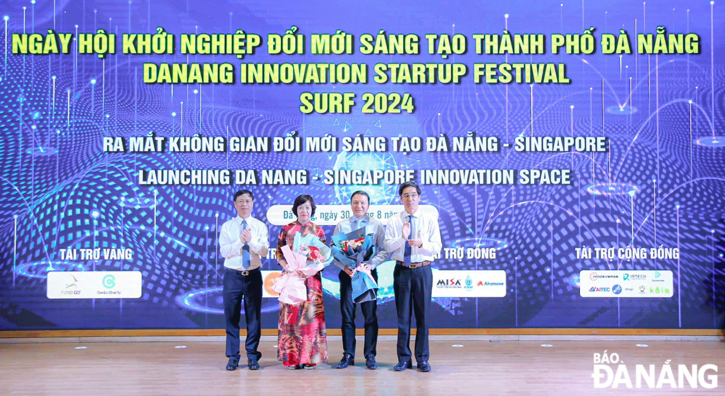 Thứ trưởng Bộ Khoa học và Công nghệ Hoàng Minh (bên trái) và Phó Chủ tịch UBND thành phố Trần Chí Cường (bên phải) tặng hoa chúc mừng ra mắt không gian đổi mới sáng tạo Đà Nẵng - Singapore. Ảnh: VĂN HOÀNG