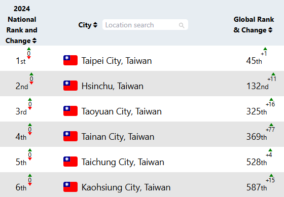 Xếp hạng các thành phố của Đài Loan trong hệ sinh thái khởi nghiệp toàn cầu (Nguồn: StartupBlink 2024)