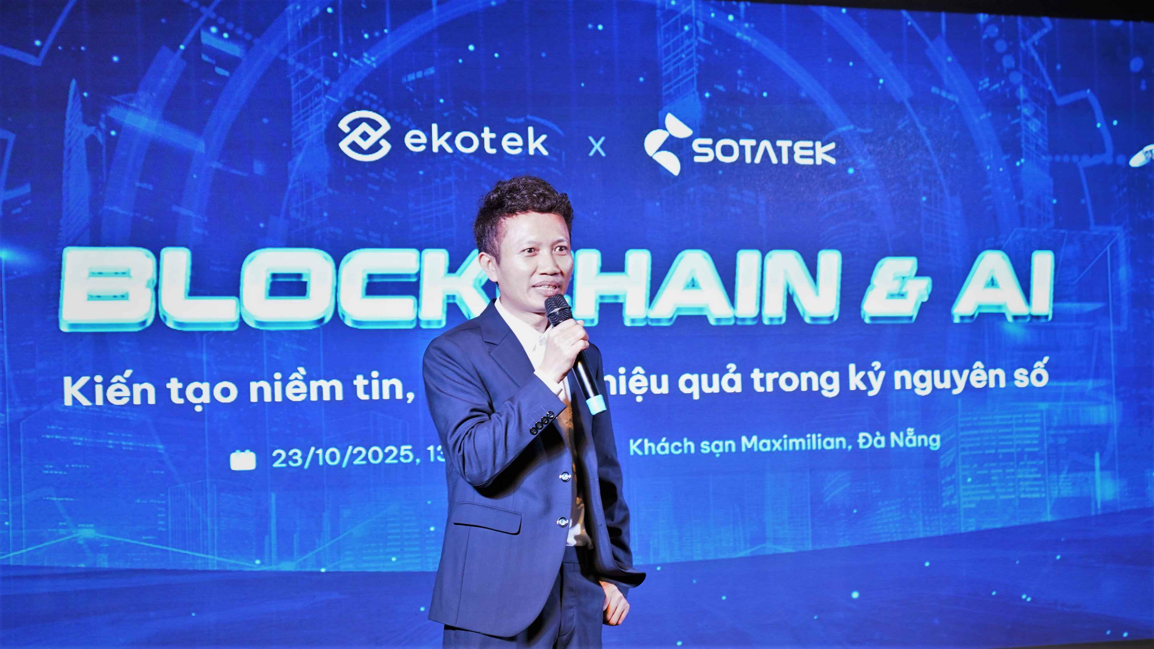 Chiều 23/10 tại Đà Nẵng, Công ty Cổ phần Công nghệ Sotatek Việt Nam và Công ty Cổ phần Công nghệ Ekotek (đây là hai đơn vị hoạt động trong lĩnh vực công nghệ chuỗi khối và trí tuệ nhân tạo) phối hợp tổ chức sự kiện “Blockchain & AI: Kiến tạo niềm tin, thúc đẩy hiệu quả trong kỷ nguyên số”. Sự kiện có sự tham dự của ông Võ Đức Anh – Phó Giám đốc Trung tâm Hỗ trợ khởi nghiệp đổi mới sáng tạo Đà Nẵng, cùng hơn 50 chuyên gia, nhà lãnh đạo doanh nghiệp và đại biểu, cùng nhau chia sẻ tầm nhìn về tương lai của công nghệ Blockchain và Trí tuệ nhân tạo trong nền kinh tế số Việt Nam.