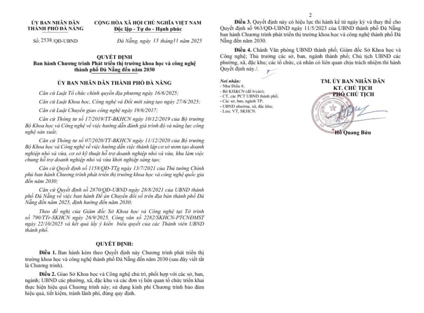 Ngày 13/11/2025, UBND thành phố Đà Nẵng ban hành Quyết định số 2358/QĐ-UBND phê duyệt Chương trình phát triển thị trường khoa học và công nghệ (KH&CN) thành phố Đà Nẵng đến năm 2030, thay thế Quyết định số 963/QĐ-UBND ngày 11/5/2023.