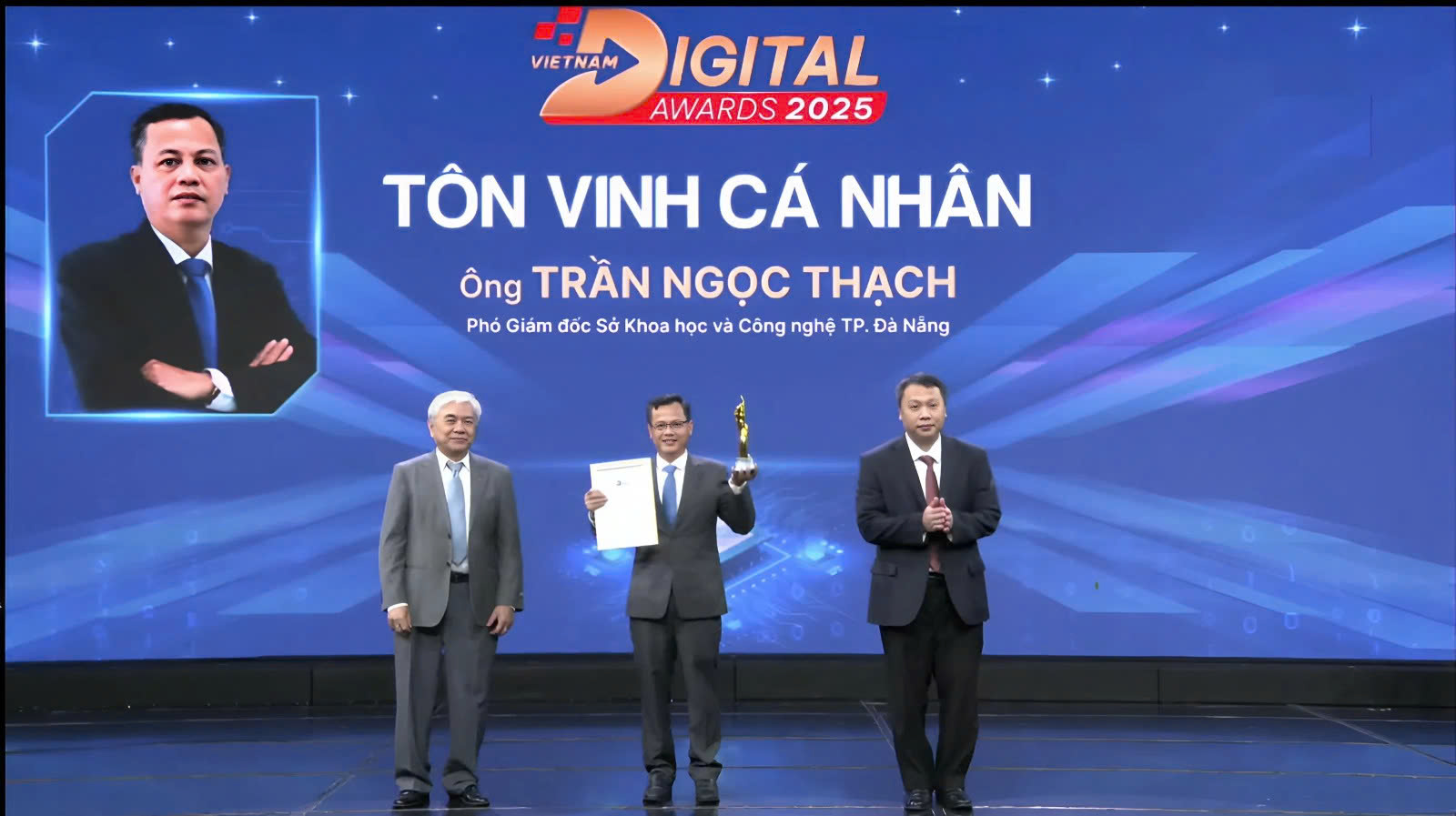 Một điểm nhấn quan trọng của Giải thưởng Chuyển đổi số Việt Nam 2025 là lần đầu tiên có thêm hạng mục giải thưởng “Tôn vinh cá nhân”, nhằm ghi nhận những cá nhân có ảnh hưởng, dẫn dắt và có đóng góp nổi bật trong quá trình chuyển đổi số tại Việt Nam. Ông Trần Ngọc Thạch - Phó Giám đốc Sở Khoa học và Công nghệ thành phố Đà Nẵng là một trong những cá nhân tiêu biểu được vinh danh tại hạng mục này. Thời gian qua, ông Trần Ngọc Thạch đã trực tiếp tham gia xây dựng và điều phối triển khai kiến trúc thành phố thông minh, đề án chuyển đổi số, đề án đô thị thông minh của thành phố Đà Nẵng, là một trong những kiến trúc sư chủ chốt đặt nền móng cho mô hình chính quyền số, đô thị thông minh hiệu quả tại Đà Nẵng, góp phần đưa thành phố Đà Nẵng trở thành hình mẫu chuyển đổi số của cả nước.