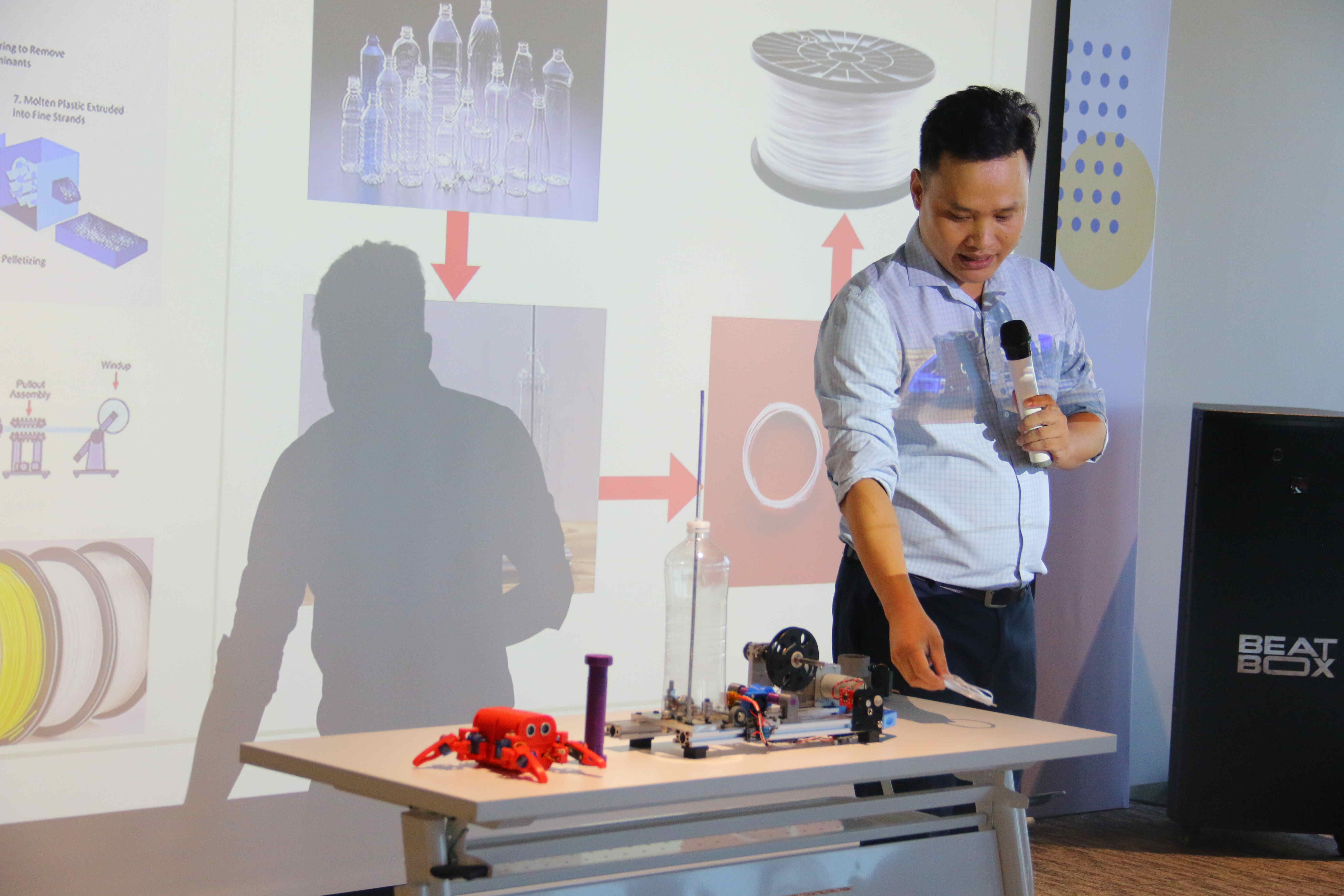 Đại diện Dự án “Sản xuất sợi nhựa in 3D từ vỏ chai nhựa đã qua sử dụng (GreenPrin 3D) thuyết trình tại Cuộc thi