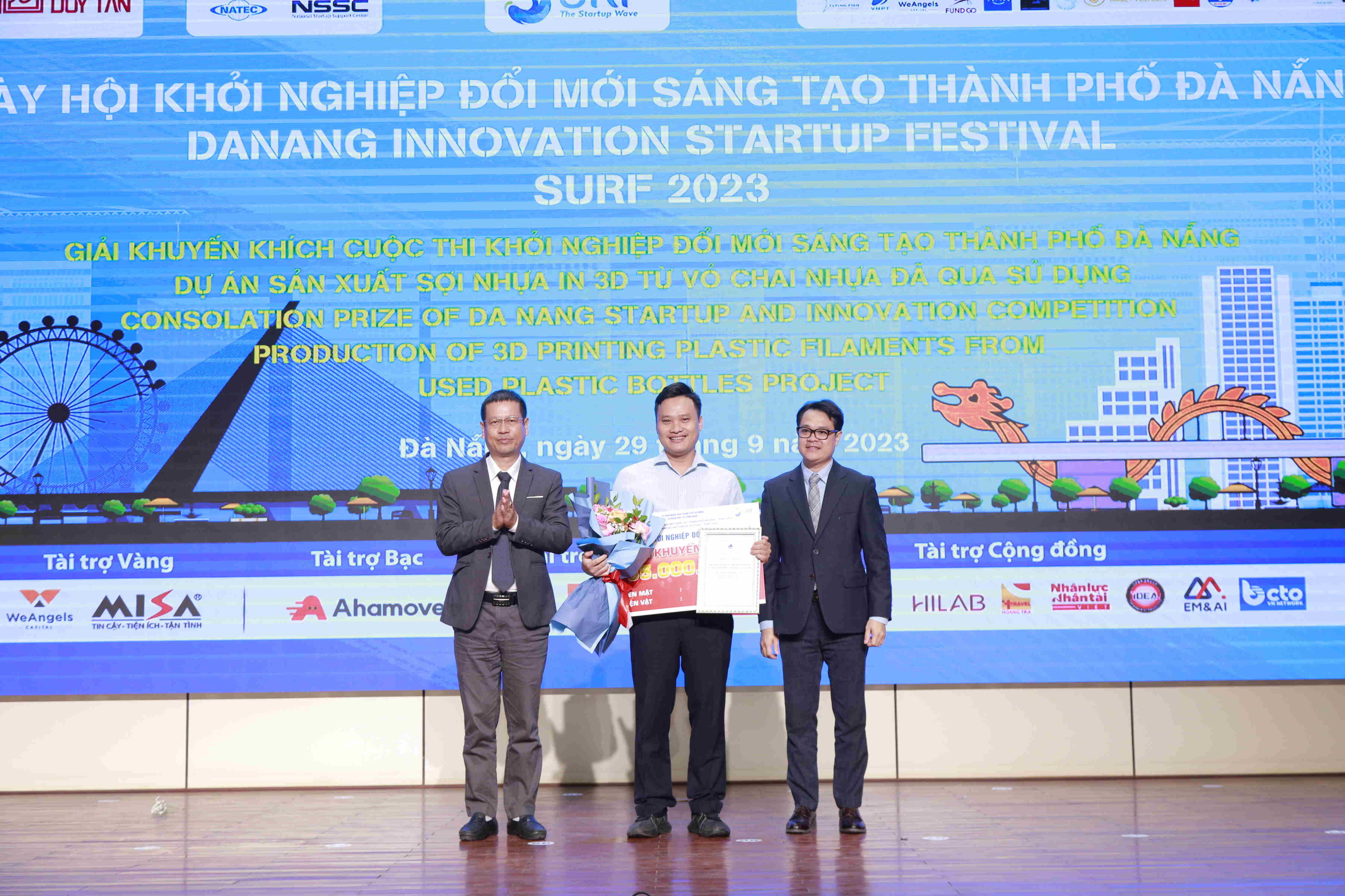 Recently, the "3D Printing Plastic Fibers from Used Plastic Bottles (GreenPrin 3D)" project excellently received an encouragement award at the Danang Innovative Entrepreneurship Startup Competition within the framework of the SURF 2023 event. Mr. Pham Quyen Anh shared, "Through the competition, I received thoughtful guidance on presentation, steps, and essential components for a startup. These are knowledge I had never learned before. In addition, the startups participating in the competition showed professionalism and a willingness to share for mutual learning."