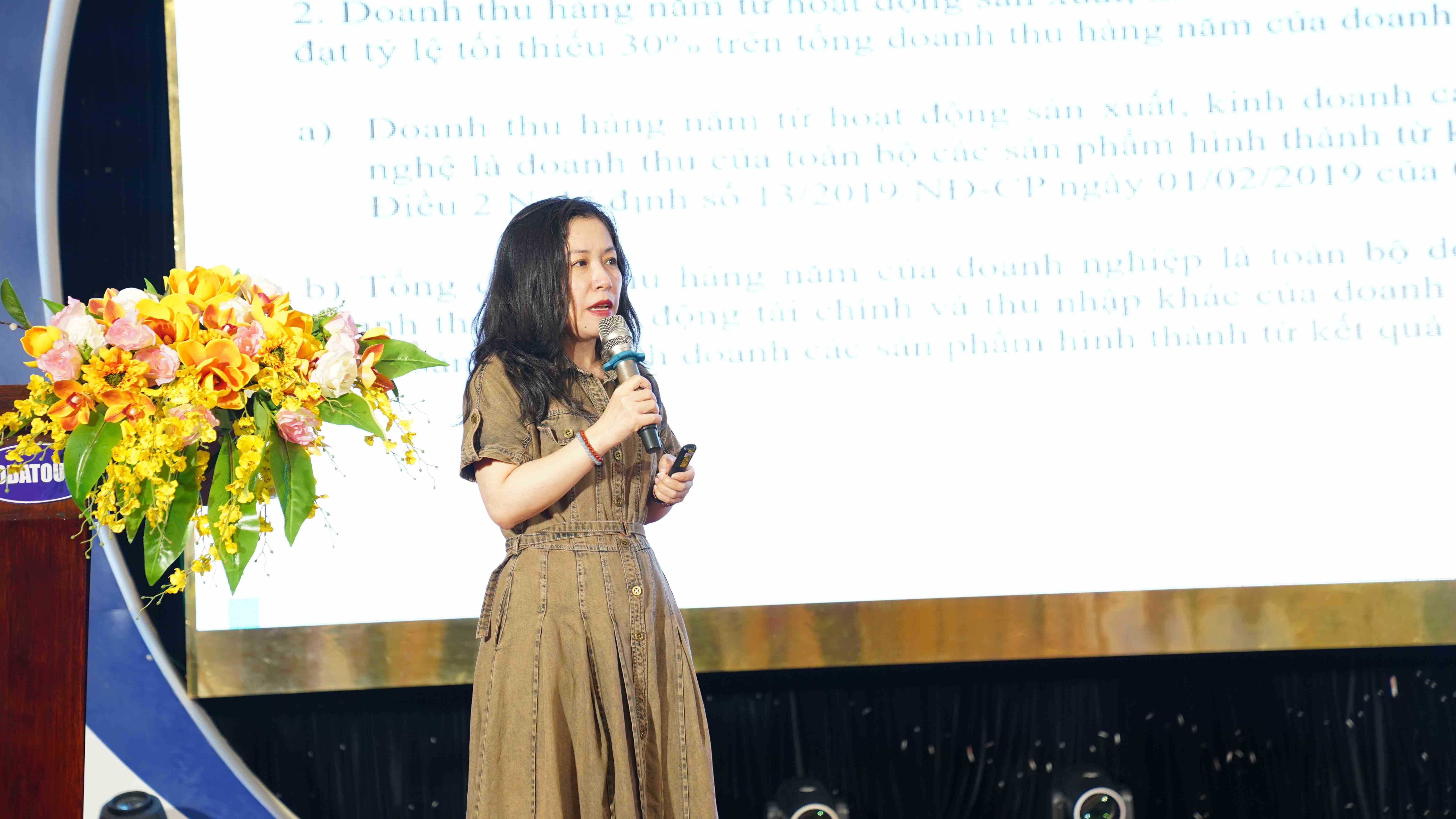 Trong khuôn khổ Hội nghị, bà Đặng Lê Thu Minh – Phó Trưởng phòng phụ trách Phòng Phát triển công nghệ và Đổi mới sáng tạo, Sở Khoa học và Công nghệ thành phố Đà Nẵng giới thiệu một số chính sách ưu đãi thuế đối với doanh nghiệp khởi nghiệp sáng tạo và doanh nghiệp KH&CN trên địa bàn thành phố Đà Nẵng, hướng dẫn chi tiết về trình tự thủ tục xét hồ sơ theo nghị quyết số 53/2024/NQ-HĐND và trình tự thủ tục xét hồ sơ cấp chứng nhận doanh nghiệp KH&CN.