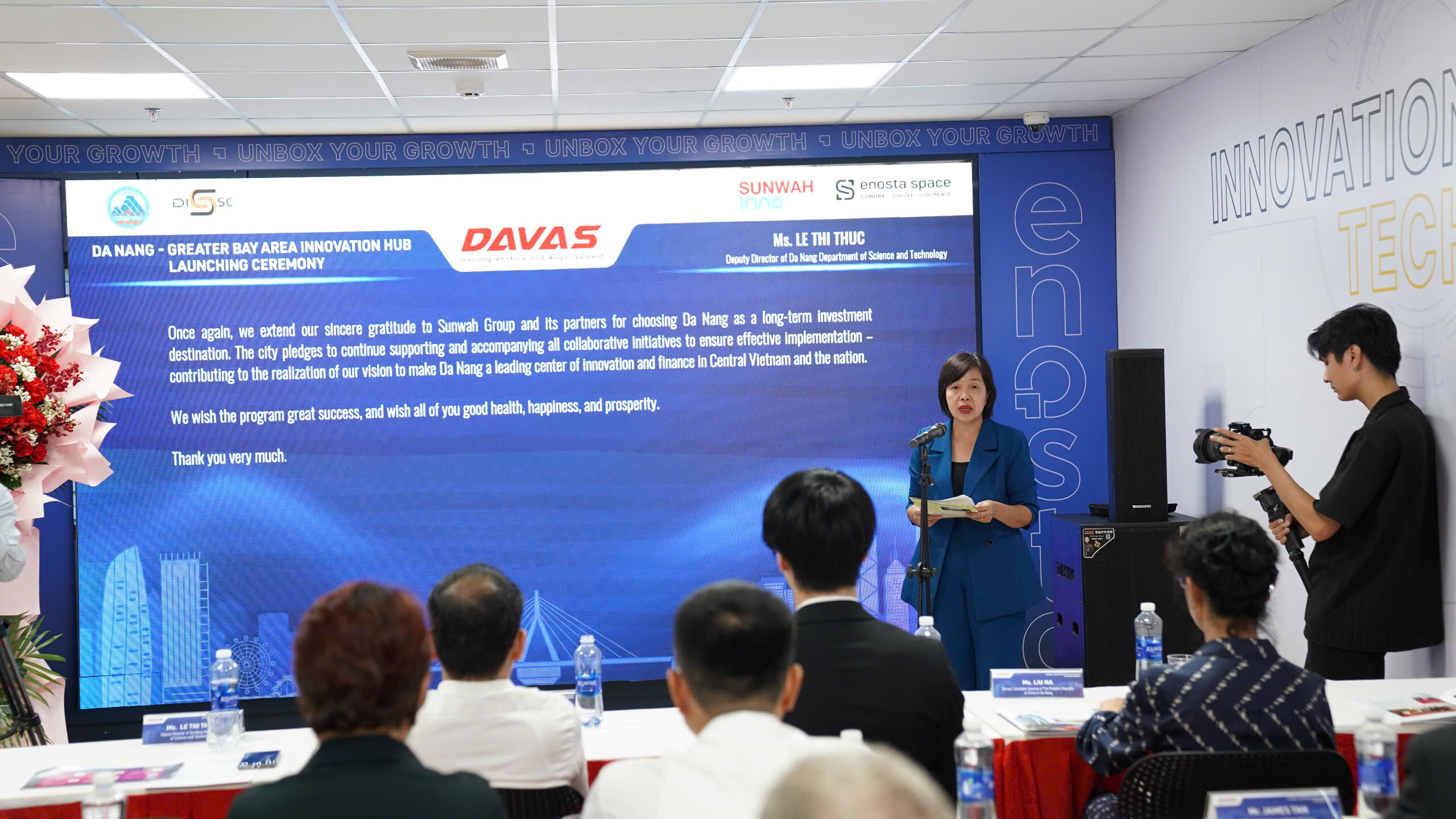 Phát biểu khai mạc, bà Lê Thị Thục – Phó Giám đốc Sở Khoa học và Công nghệ thành phố Đà Nẵng cho biết Lễ ra mắt Không gian đổi mới sáng tạo Đà Nẵng - Vùng Vịnh lớn là một dấu mốc quan trọng trong hành trình phát triển hệ sinh thái khởi nghiệp đổi mới sáng tạo tại thành phố Đà Nẵng. Không gian này sẽ là nơi hội tụ những chuyên gia, nhà khoa học, nhà đầu tư, quỹ đầu tư, tổ chức khởi nghiệp và hỗ trợ khởi nghiệp hàng đầu châu Á. Đây không chỉ là sự kiện mang tính biểu tượng, mà còn mở ra một chương mới trong hợp tác đầu tư về khoa học công nghệ, đổi mới sáng tạo và giao lưu học hỏi giữa doanh nghiệp khởi nghiệp Việt Nam và quốc tế.